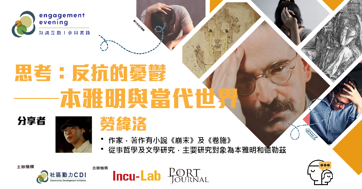 在動盪不居的當代世界,我們面對靈性修養的匱乏、政治環境的陰霾、技術發展的不安,似乎無法避免陷入憂鬱 (melancholy) 。然而,如果憂鬱並不流於被動的、頹廢的,甚至是絕望或瘋狂的情緒狀態,而是能夠作為讓思考得以澄明湧現的獨特裝置,我們可以從中萃取怎樣的激進反抗力量?在這次講座中,勞緯洛將為參與者介紹德國哲學家本雅明 (Walter Benjamin) 關於憂鬱的思考。以憂鬱之名,本雅明採掘古希臘、中世紀、基督教、卡巴拉、巴洛克及浪漫派等多重資源,匯聚出特屬二十世紀初的思想星叢,在他思想發展到後期,更由此展現了甚具政治批判意味的洞見。